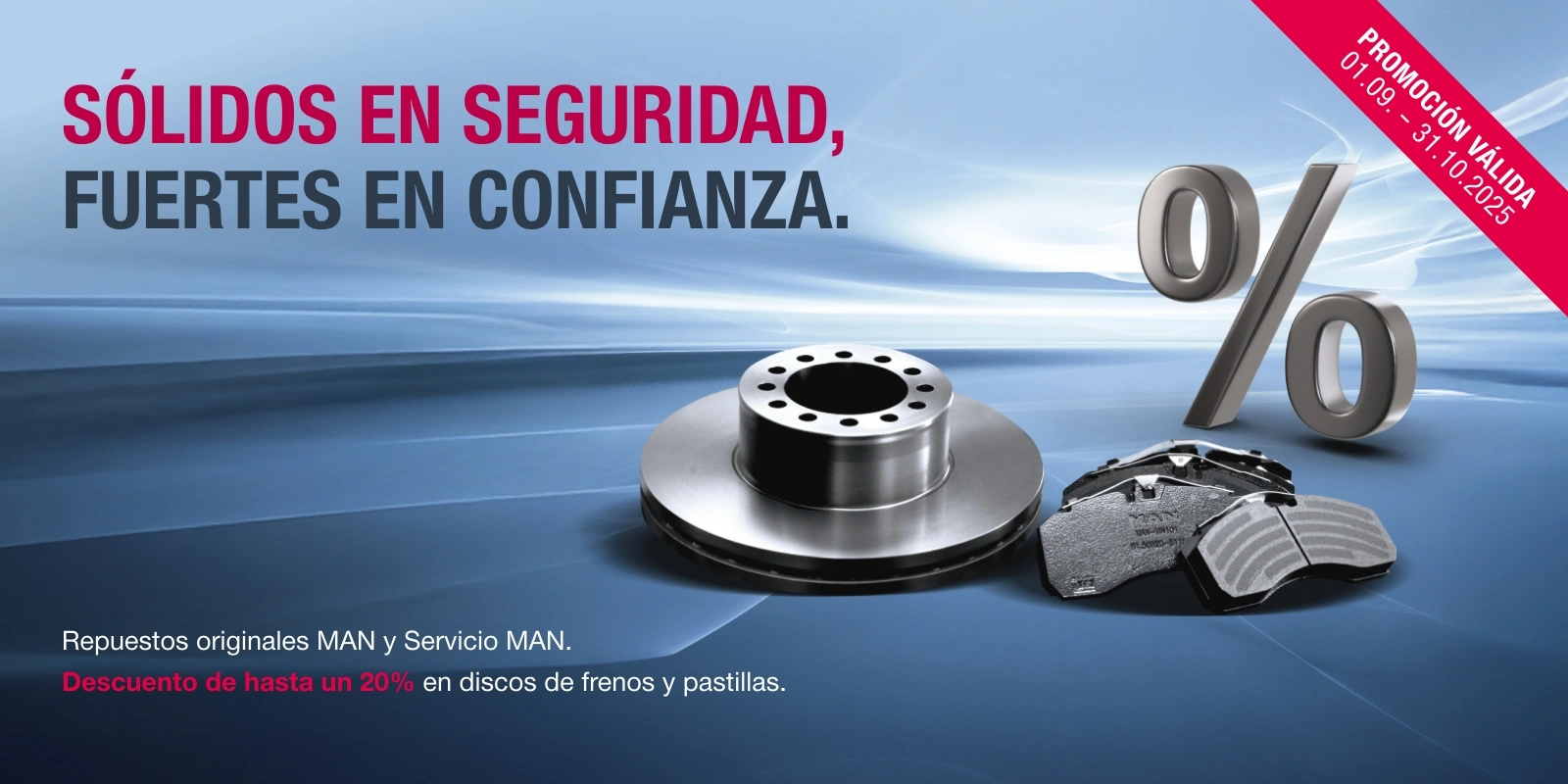 Promoción válida en todos los concesionarios adheridos de MAN sujeto a stock disponible de discos de frenos y pastillas seleccionados. Descuentos hasta un 20%. Válido desde el 01 de septiembre al 31 de octubre de 2025
